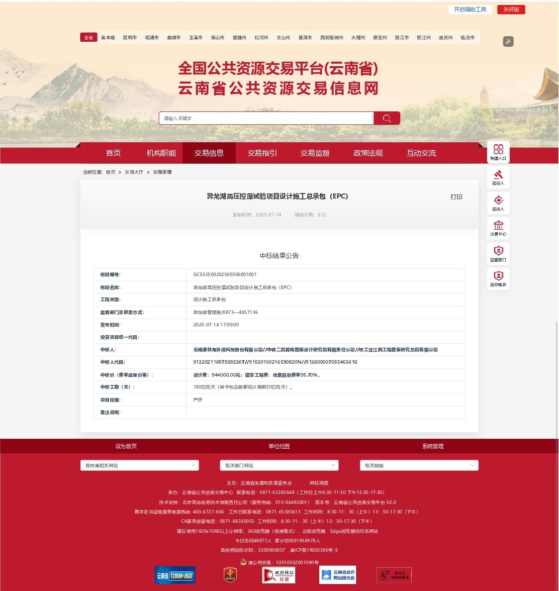 《異龍湖高壓控藻試驗項目設(shè)計施工總承包(EPC)》項目中標結(jié)果公告